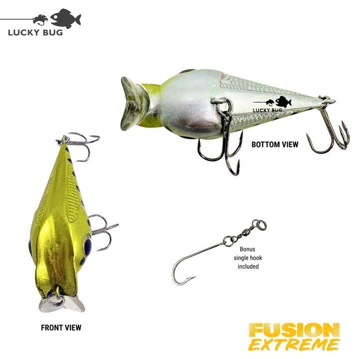 The Fusion Extreme crank-bait is an amazing lure with vibrant, erratic darting action that triggers aggressive reaction strikes from predatory fish. This lure also features two hook locations (and comes pre set with 2 treble hooks). PLUS, we include a single hook in the package for even more versatility, to allow you to set it up for your specific presentations, whether you're in rivers, lakes or oceans.