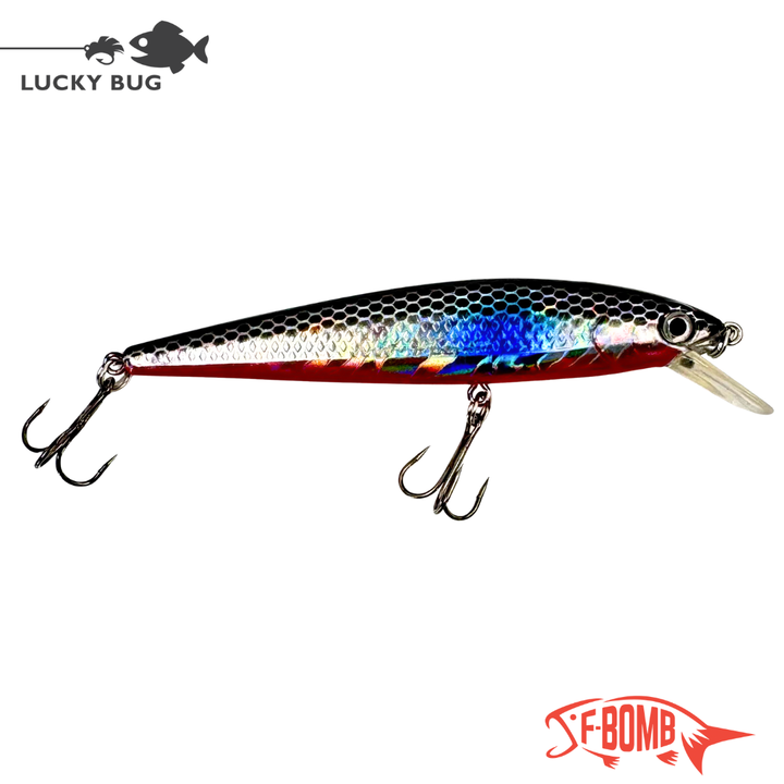 Our F-Bomb floating lure is designed to impress – whether it’s twitched top water as a surface bait, retrieved as a shallow runner, weighted with a split shot for medium depths or bottom walked off a three – way swivel or bottom bouncer – this wounded minnow action and a loud rattle, compels fish to bite, even when they’re not hungry!