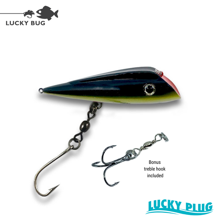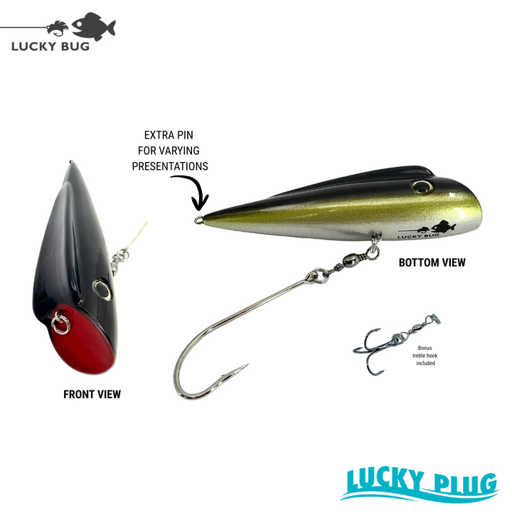 These Lucky Plugs come rigged with a single hook attached to the middle pin but we have also included a treble hook in the package to allow for a variety of hook configurations and presentations. PLUS, we now have a second pin on the tail for even more flexibility!