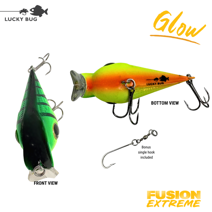 The Fusion Extreme crank-bait is an amazing lure with vibrant, erratic darting action that triggers aggressive reaction strikes from predatory fish. This lure also features two hook locations (and comes pre set with 2 treble hooks). PLUS, we include a single hook in the package for even more versatility, to allow you to set it up for your specific presentations, whether you're in rivers, lakes or oceans.