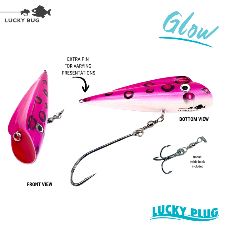 These Lucky Plugs come rigged with a single hook attached to the middle pin but we have also included a treble hook in the package to allow for a variety of hook configurations and presentations. PLUS, we now have a second pin on the tail for even more flexibility!