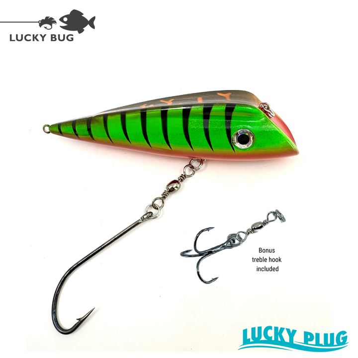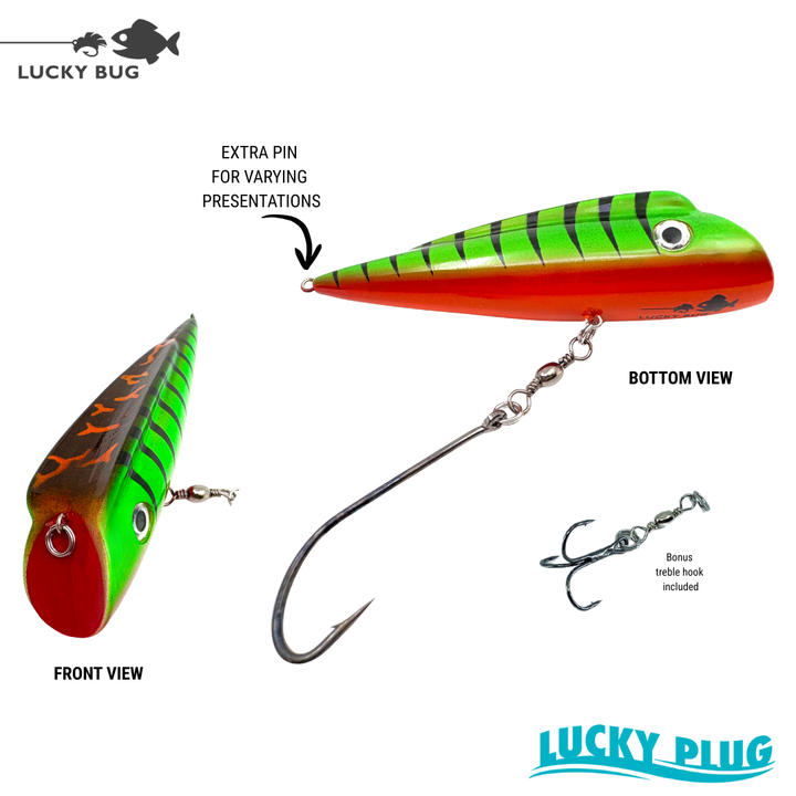 These Lucky Plugs come rigged with a single hook attached to the middle pin but we have also included a treble hook in the package to allow for a variety of hook configurations and presentations. PLUS, we now have a second pin on the tail for even more flexibility!